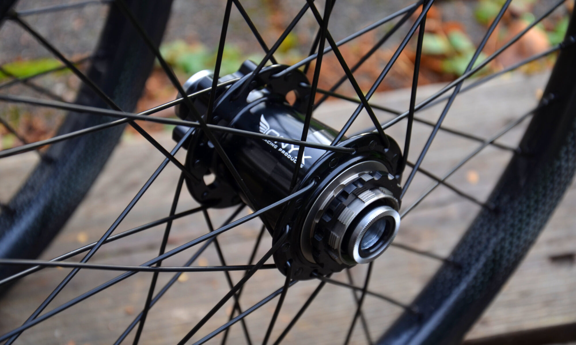 - Onyx Racing Products BMX front hub with 100x20mm thru-bolt axle.